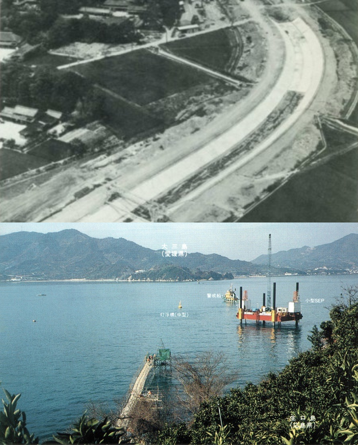 中央開発は、1971年に本四連絡橋の尾道~今治ルート調査を実施し、その後も海峡部と陸上部の地質調査や岩盤試験に携わりました。1986年には、来島大橋関係の調査を実施。特に来島海峡は、渦潮の名所で最大潮流8ノット、最大水深40mと厳しい条件下で、3台のボーリング機を搭載した大型SEPを使用し、昼夜兼行で作業にあたりました。
